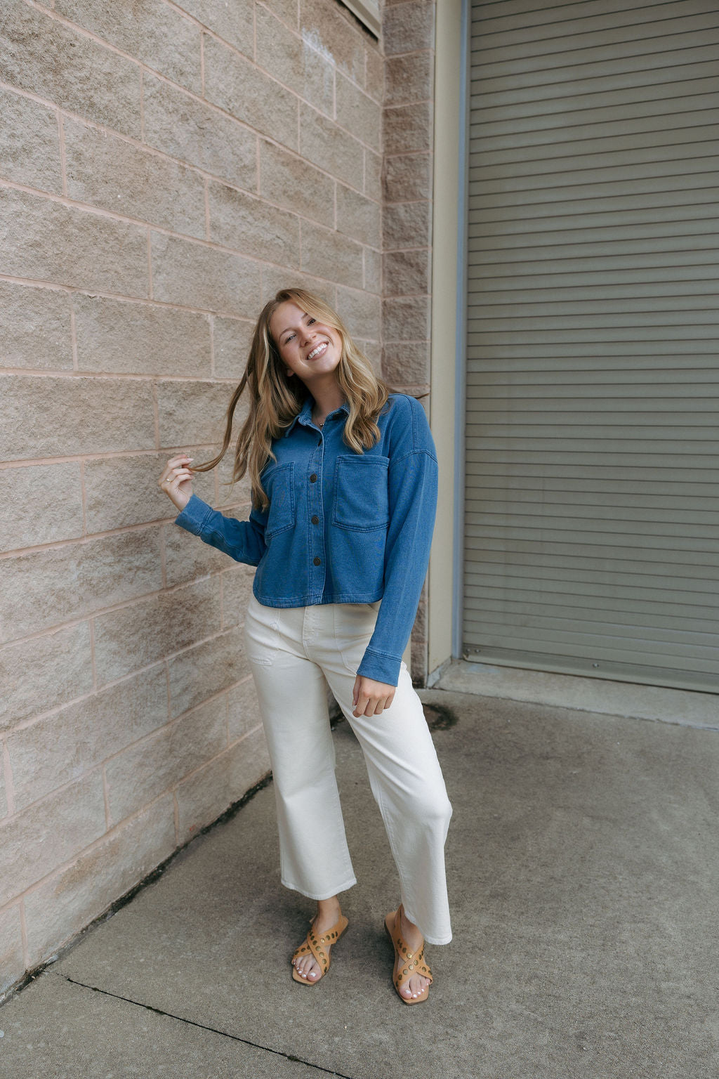 Fit: True to size, cropped length, collared neckline, full button up front, long sleeve, front patch pockets. Model is wearing a size small.