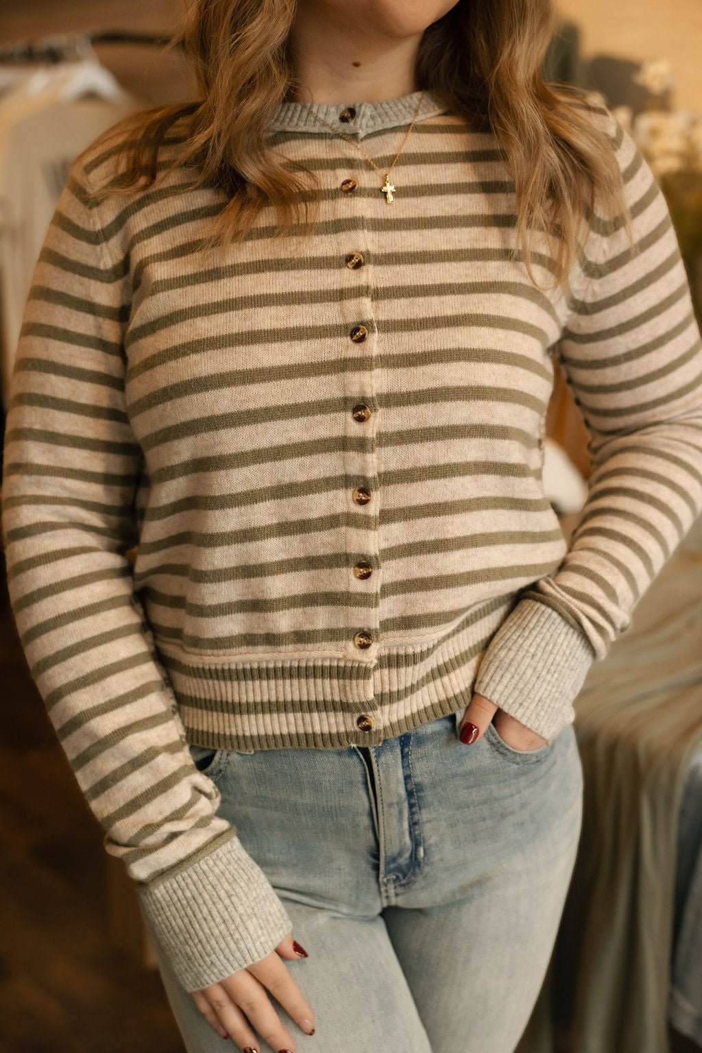This cardigan does run on the more fitted side, model wearing size medium.