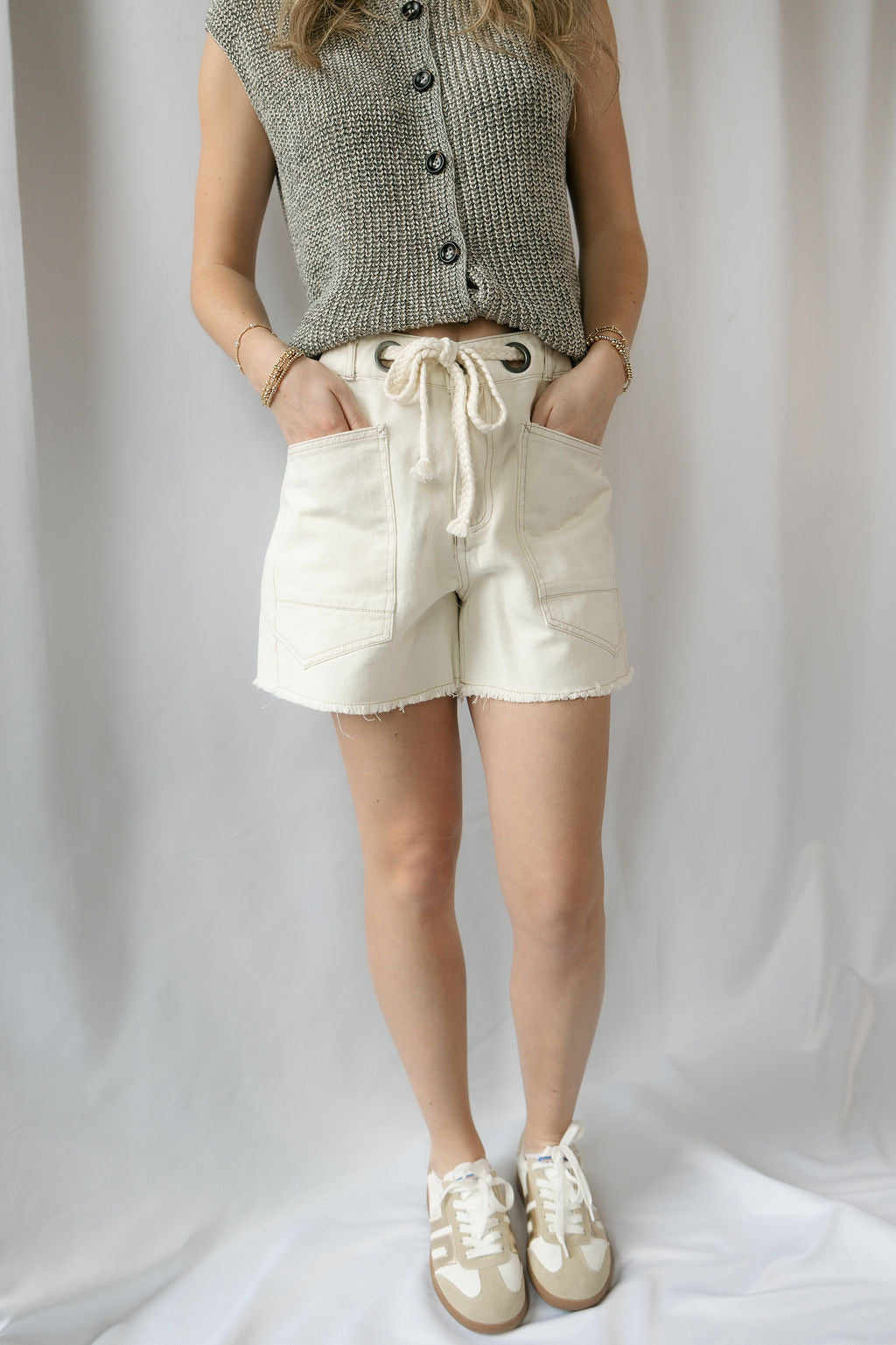 Description: Our Millie Drawstring Shorts in Ecru are the perfect go-to for spring and summer, featuring a comfortable drawstring waist and fun detailing that adds a stylish touch to this everyday staple. Ideal for walking or casual outings, these versatile shorts can easily be dressed up or down to fit any laid-back or polished look.