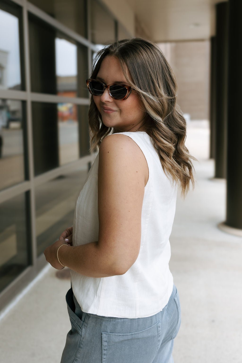 The Anastasia Vest in White is a unique piece that adds a touch of fun to any outfit. With its button down design and sleeveless style, it's perfect for spring and summer. Its classy look ties together any look while keeping you cool and comfortable.