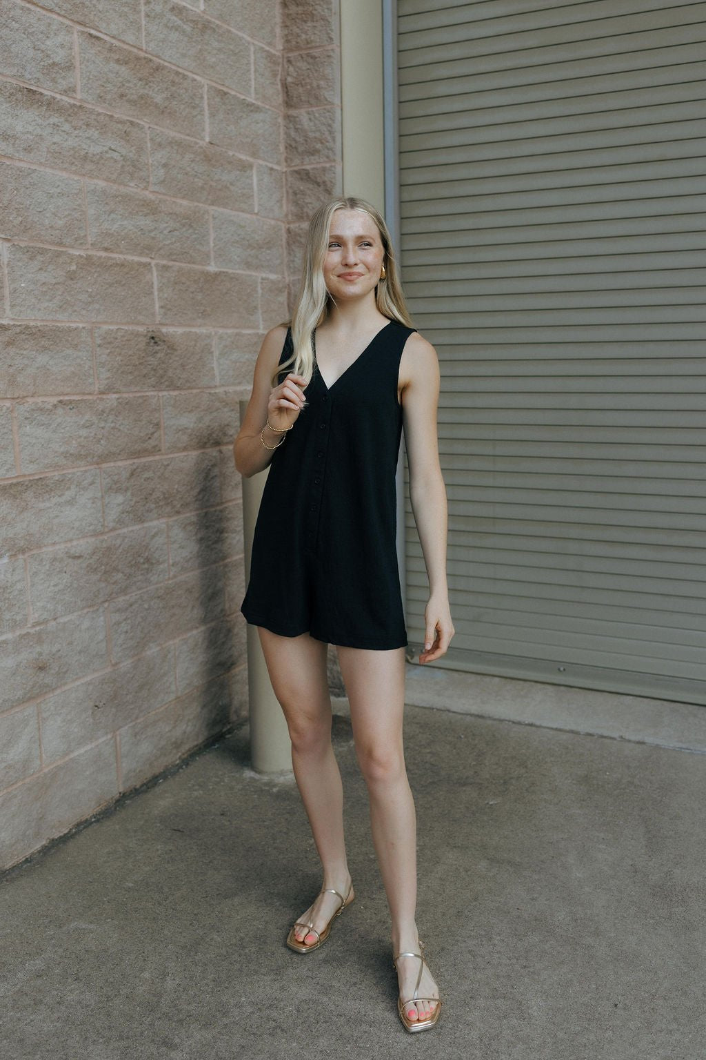 This black textured romper offers a simple and comfortable fit perfect for year-round wear. Featuring a sleeveless design and a flattering v-neckline, it closes easily with buttons for added convenience. Its versatile style makes it an effortless choice for any occasion.